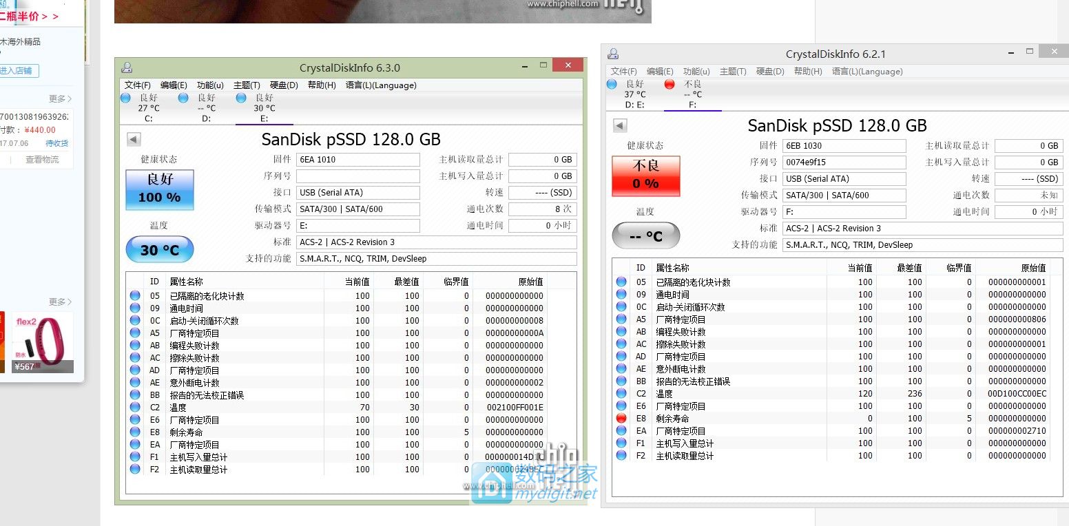 用CrystalDiskInfo看了下硬盘信息,很费解为什么我的U盘剩余寿命是0,是ssd主控的原因?可是为什么网上其他的测试不这样,左面是网友同款的,右面我的,固件也不一样,翻水水了?![]()